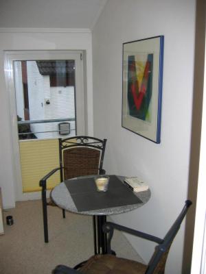 Das helle Wohn- /Esszimmer ist modern eingerichtet. Ein Sofa, das im Notfall zur Schlafcouch ausgeklappt werden kann, eine kleine Essecke, ein 42“ LED-Fernseher (Kabelanschluss) laden zum entspannten Feierabend ein. Fußbodenheizung. DSL 16000 - Flat.