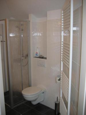 Das Badezimmer ist ausgestattet mit WC, Dusche, Handtuchwärmer und einem Waschbecken.